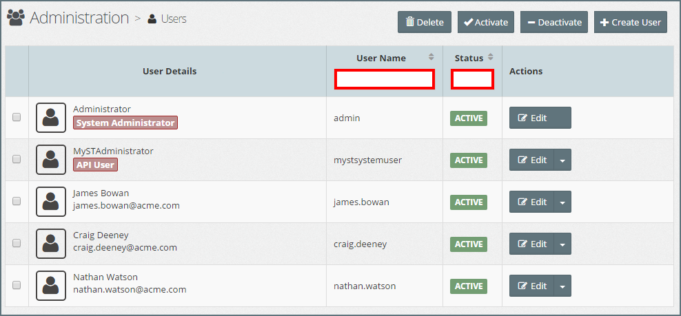 The list can be filtered \/ sorted by User Name or Status, by entering the filter criteria in the filter fields (outlined in red in the above screen-shot)