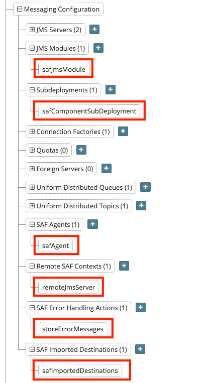 To create SAF objects, open a blueprint or model for any configuration with components using a WebLogic Server domain (eg. Oracle Service Bus, Oracle Traffic Director) and expand the object tree for the domain under WebLogic Domain Configuration > Messaging Configuration