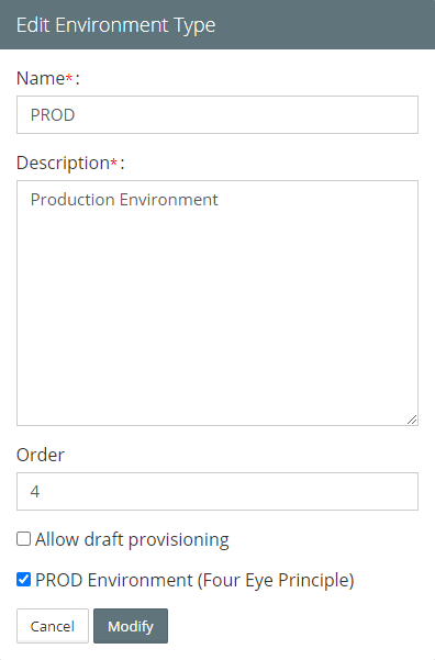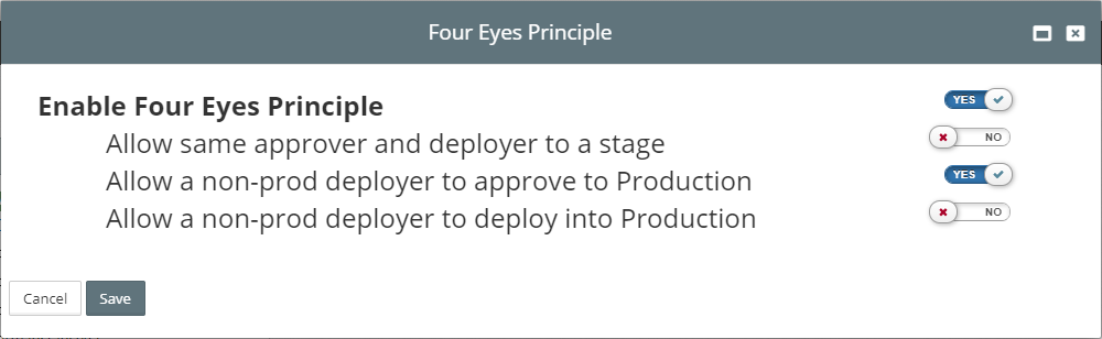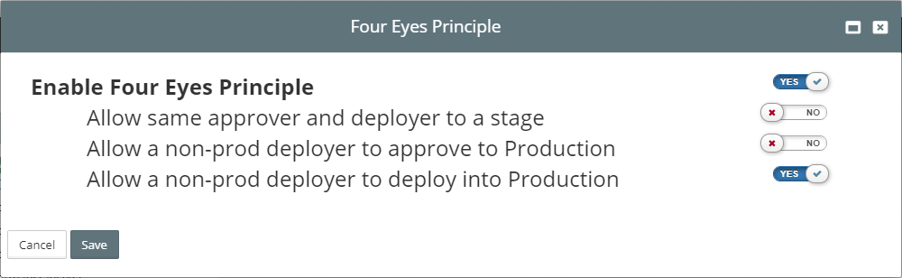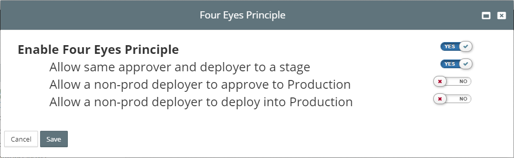 Infrastructure > Environment Types Edityour production environment- Check PROD Environment (Four Eyes Principle) and click