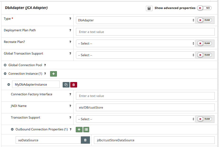 • Outbound Connection Properties - Contains the name-value properties that are used to configure the JCA Adapter instance.