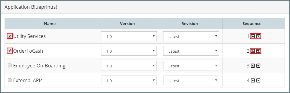 • Sequence - This defines the sequence in which Application Blueprints are deployed. To change the order, simply click on the up or down arrow next to the Application Blueprint (outlined in red above) to move it to an earlier or later stage in the deployment.