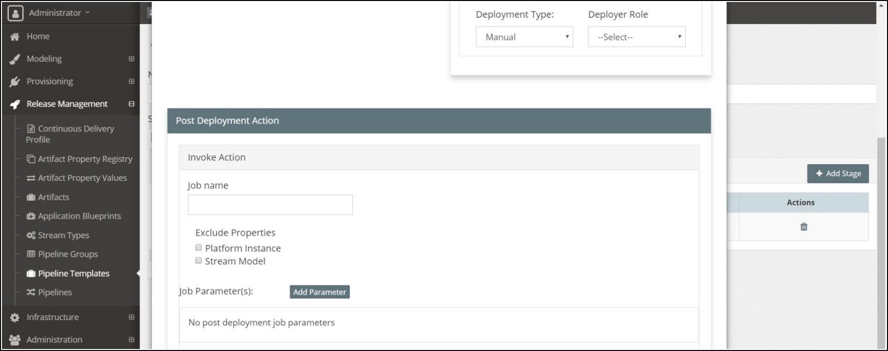 To configure post deployment action, we will see a drop down in the streamstage (as in the image below) and click on post deployment action