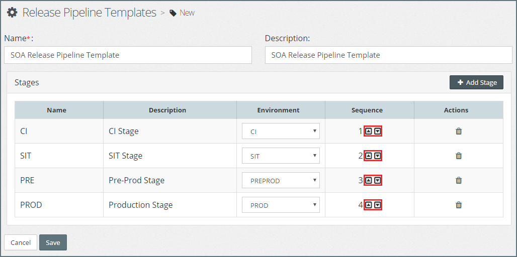 If we wish to change the stage sequence, simply click on the up or down arrow next to the stage (outlined in red in the above screenshot) to move it to an earlier or later stage in the pipeline template.