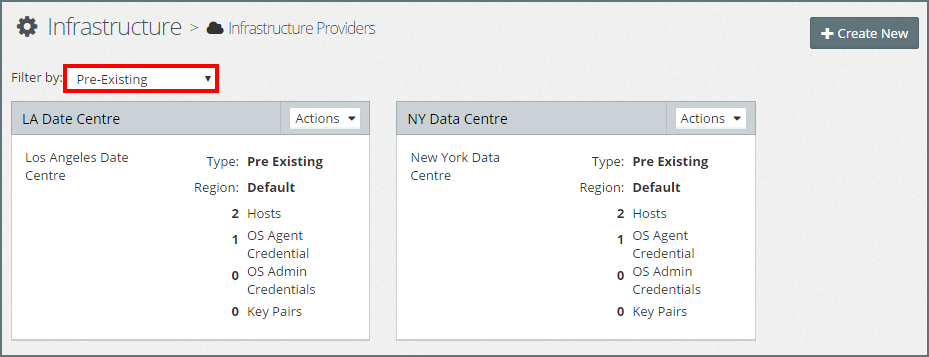 To see details of the defined Infrastructure Providers, click Infrastructure > Infrastructure Providers. By default, this will display details of All Infrastructure Providers. We can filter this by selecting Pre-Existing in the Filter by drop down as shown below.