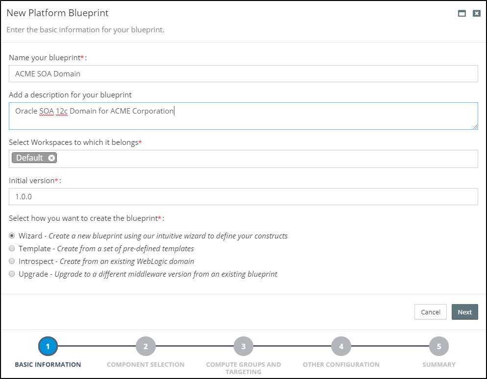 - Wizard: This guides the user through a simple process to capture the key design decisions for the Oracle Middleware topology and configuration and creates a corresponding Platform Blueprint.