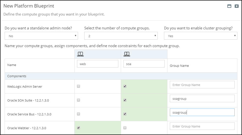 However, there may be instances where you might want to host more than one component in the same WebLogic cluster. To allow for this, you can choose Yes for Enable Cluster Grouping in this step and associate a logical label for the components you want to group together.