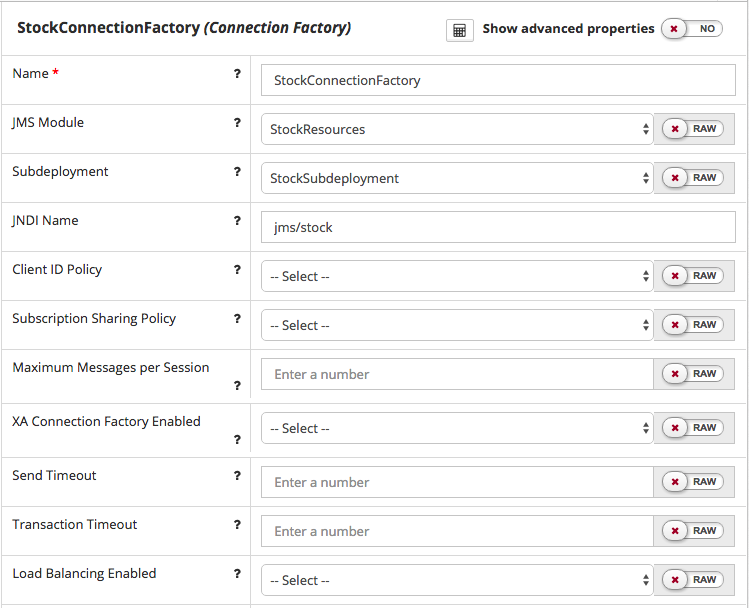 Navigate to Connection Factories under the Messaging Configuration. Either select an existing Connection Factory to edit or click on the + icon to add a Connection Factory.