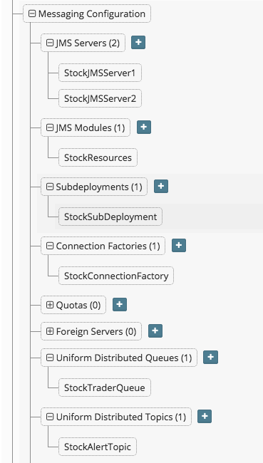 The following screenshot illustrates a typical JMS configuration within a Platform Blueprint, for a two node cluster, we would define two JMS Servers as illustrated below. Plus a corresponding JMS Module consisting of one Sub Deployment and the required connection factories, queues and topics.