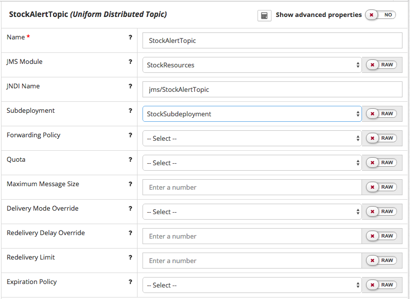 For each Uniform Distributed Topic we need to specify the following properties (if not specified WebLogic will use default values):