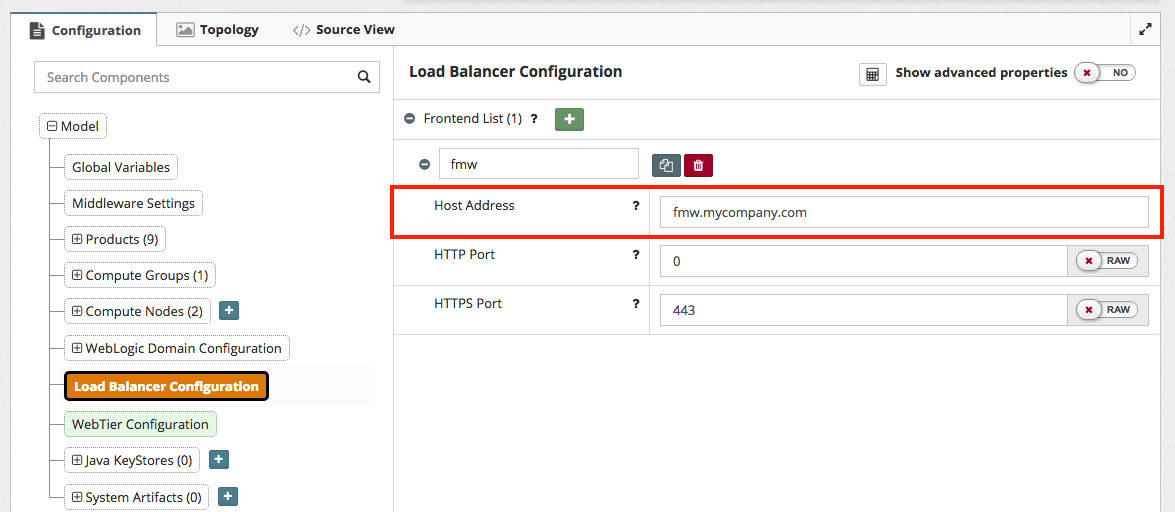 Once one or more Frontends are set in the Platform Blueprint, you will need to define the Host in the Platform Model as shown below. This field will show once you have selected to Edit Configuration in the Model editor.