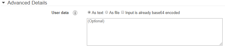 Note: In both the formats user data size is limited to 16K KB. If you need to enter the commands greater than 16K KB size, you need to enter the input which is base64 encoded and tick the “Input is already base64 encoded” checkbox.