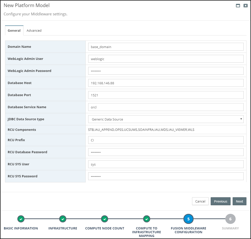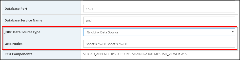 • JDBC Data Source type - This option is used to specify the Data Source Type for Oracle Middleware specific schemas which are created by the Oracle Middleware Repository Creation Utility (RCU). This will default to the value specified in the Platform Blueprint but can be overridden here.