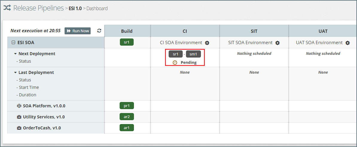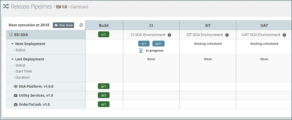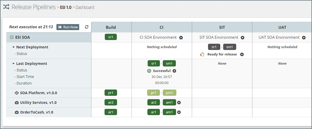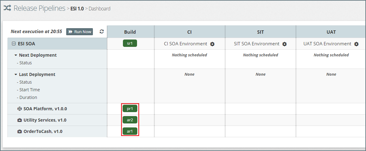 In addition to each stage, the dashboard also illustrates the Build stage, which shows the latest revision of each component available for promotion through the release pipeline.