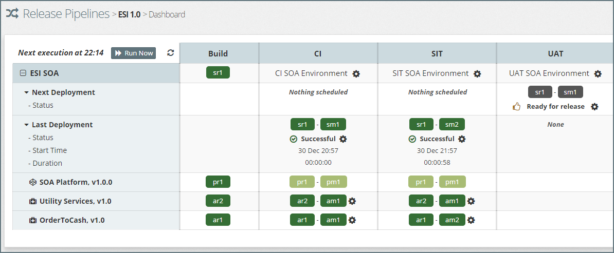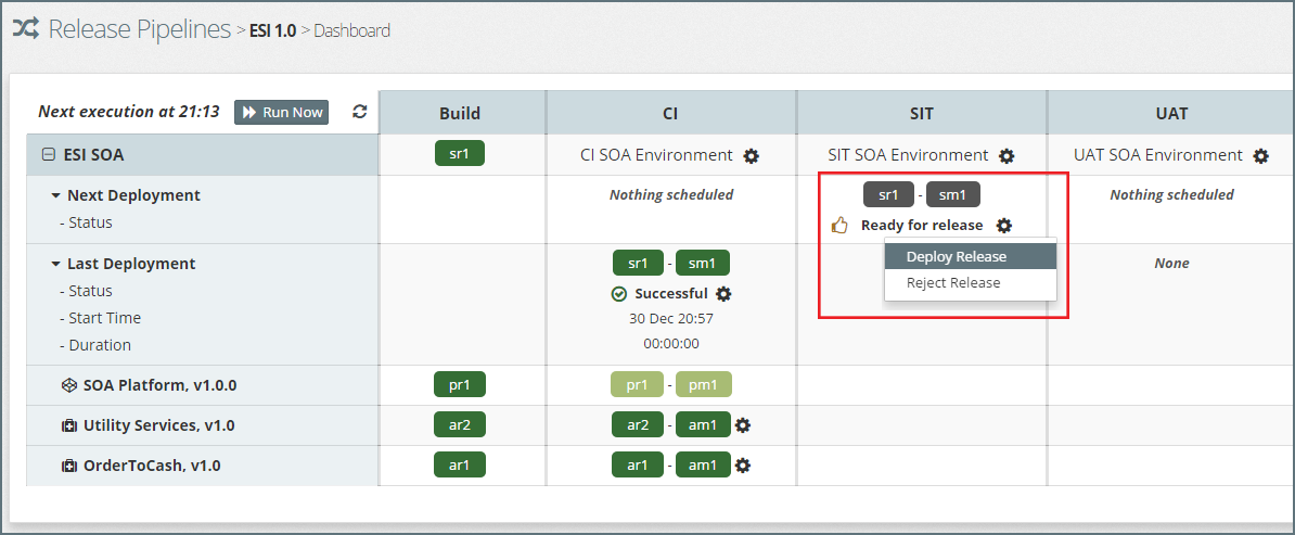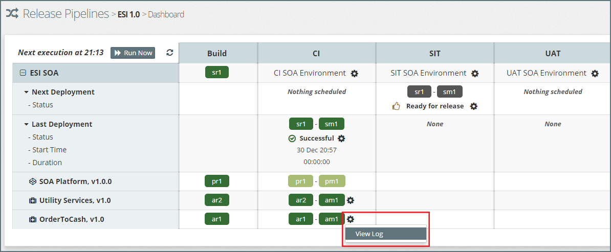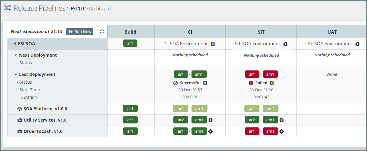 The Release Pipeline Dashboard provides a ‘single pane of glass’ to monitor and manage the promotion of applications and platform configuration changes through each staging environment and into Production.