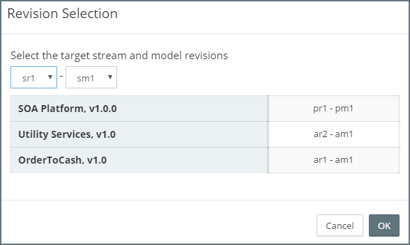 Myst will open the Revision Selection dialog, where we can select which stream revision we wish to deploy and the corresponding stream model revision.